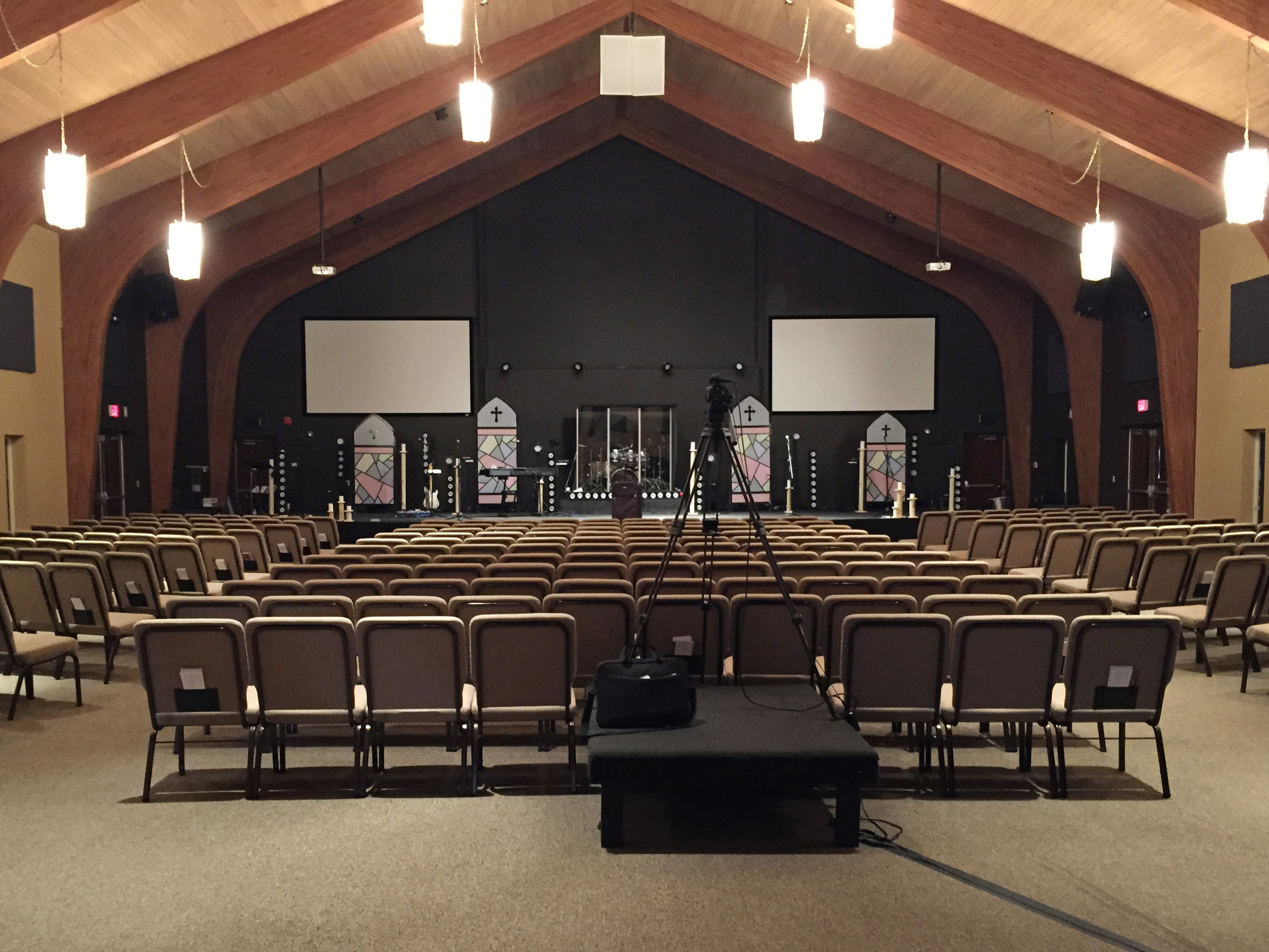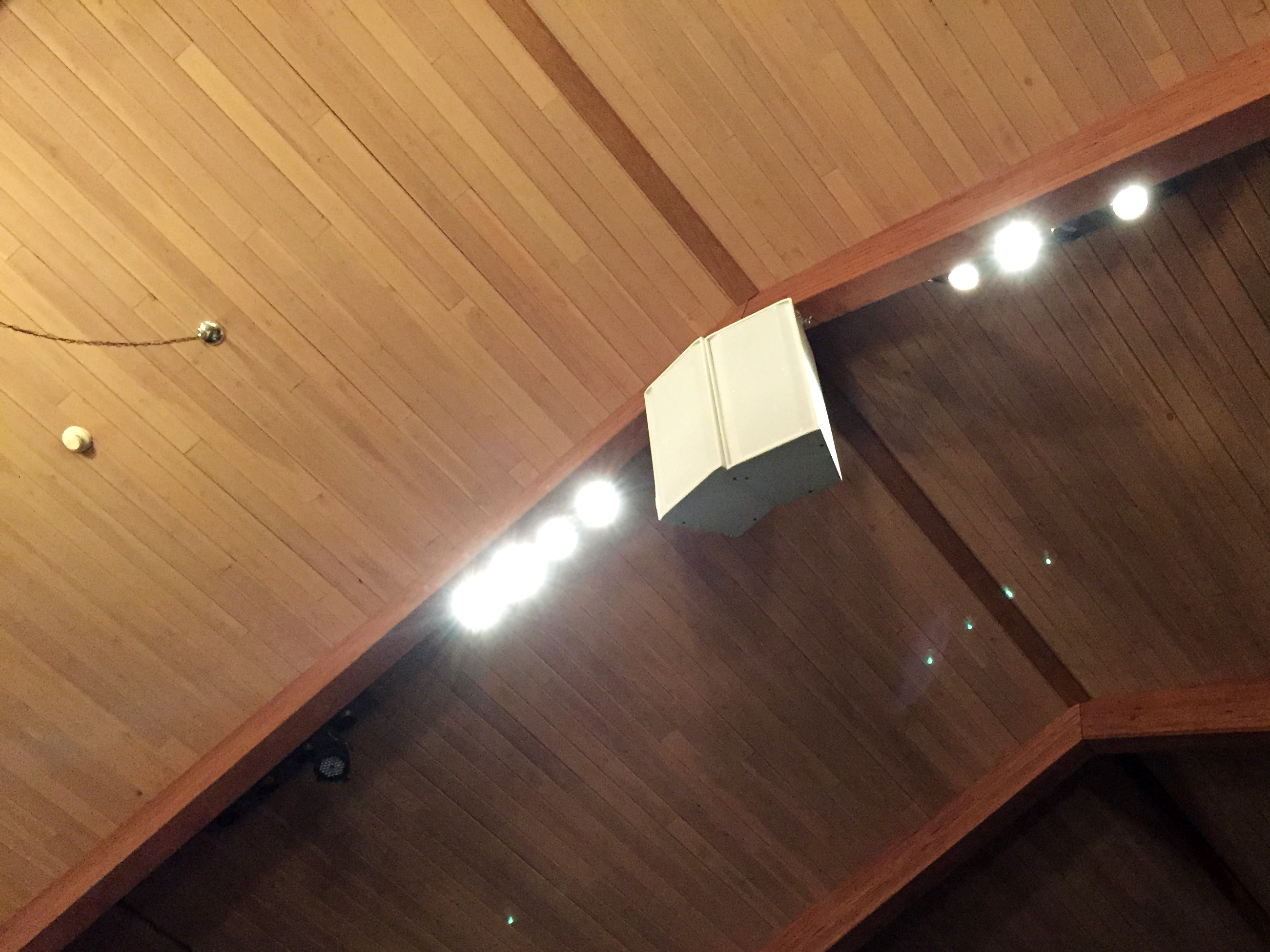 The Community speakers were hung in a mono narrow point-source array at the top center of the building. Unfortunately, the coverage from these speakers was not correctly suited for the room. The first downside is that they were hung without enough vertical tilt down to direct the sound toward the congregation. Because of the lack of tilt, there was too much energy going directly toward the back wall which was causing problems. Another downside of how they were hung is that they were put side by side to each other. When placed side by side, the speakers couple and create a “narrow point-source array”. Because the wide coverage pattern of each speaker, the middle of the array has an overlap in coverage. This has the advantage of narrowing the combined pattern due to the summation in the middle which gives more energy in the middle of the array.
