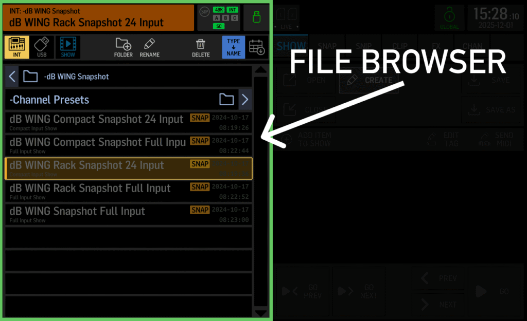 The left side of the Library screen is your file browser. This is where you navigate the internal storage of the WING, a USB thumb drive plugged into the USB port, and—once you’ve created or loaded a show—the Show tab for navigating your scenes.
