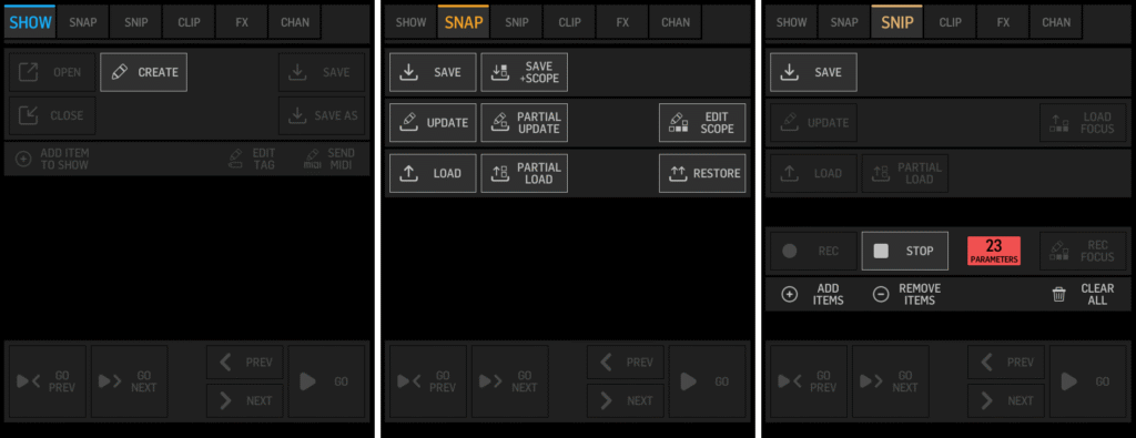 You’ll see a parameter count on screen that updates in real time as you make changes. When I’m building a snippet for song transitions, I might see “4 parameters” after adjusting two faders and two mute buttons.