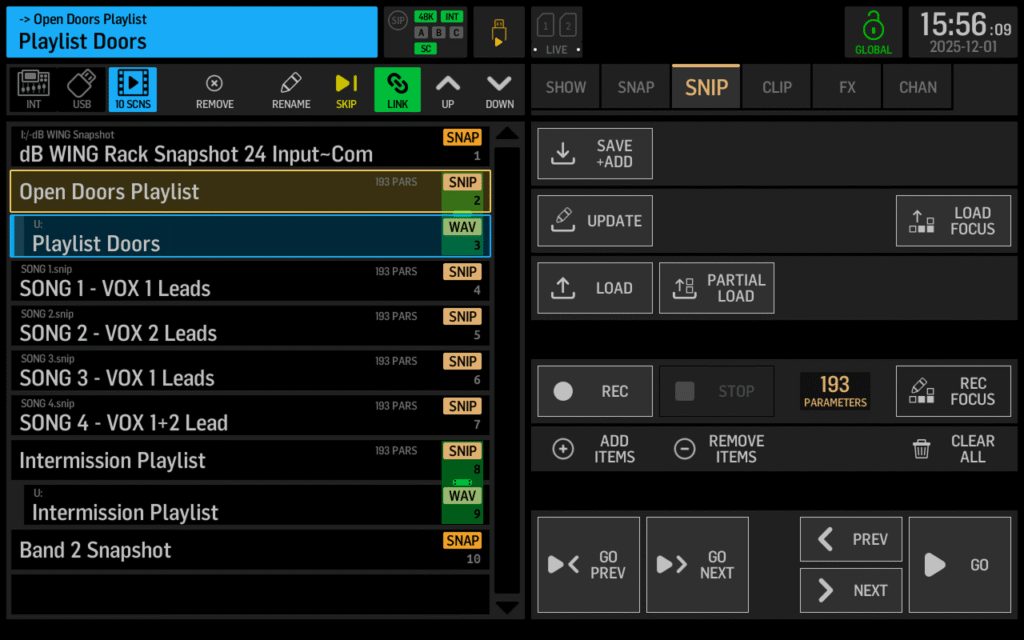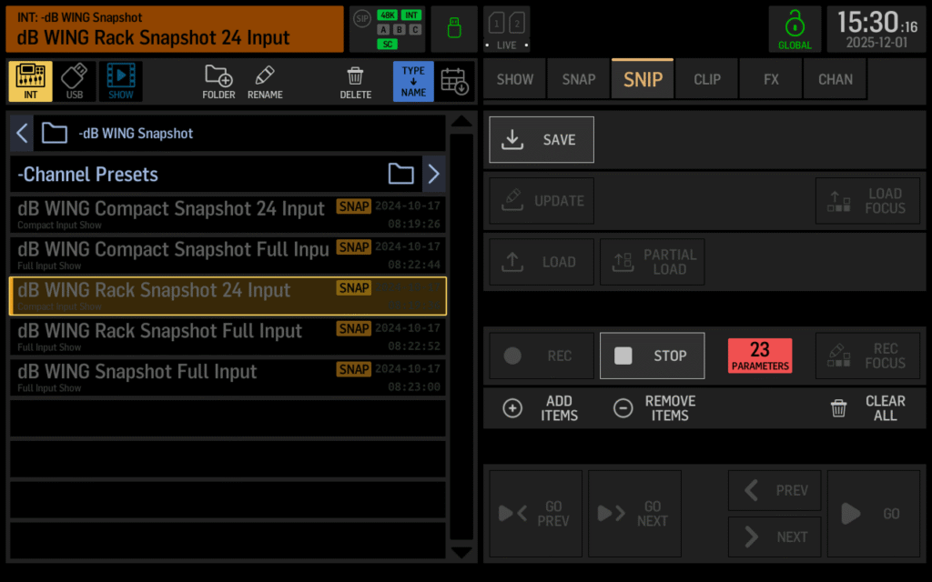 You have to be very careful about when you load scenes. Unlike some other consoles, Behringer WING snapshots and snippets do not offer crossfade times. The moment you press Go, every parameter loads instantly.
