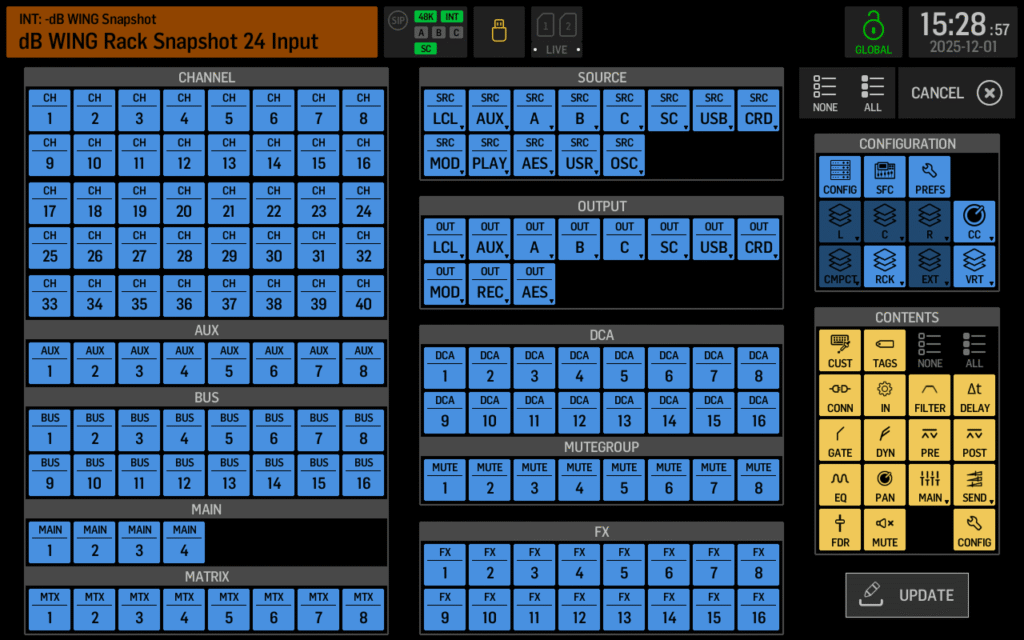 Let’s say you’re running a Christmas service where the band lineup stays the same, but you need to adjust fader and mute positions between songs. You don’t want to reload every EQ, compressor, and routing setting—you just want the faders and mutes to change. That’s exactly what snippets are for.