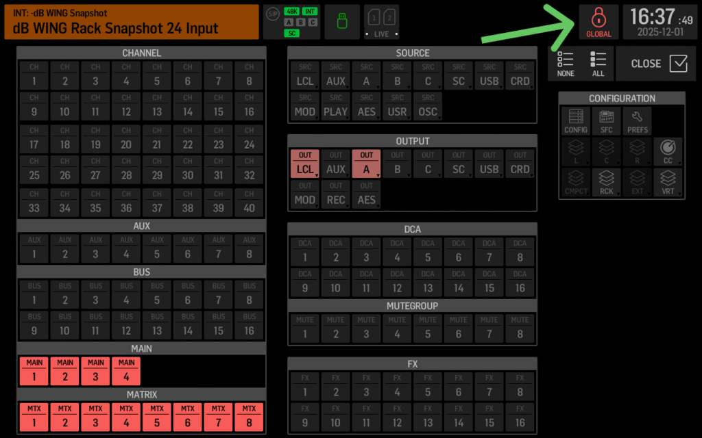 This is my go-to for protecting things like my main output levels or monitor engineer’s bus settings during a service. I will typically safe my output routing for my Main PA, Streaming Outputs, Lobby, etc.
