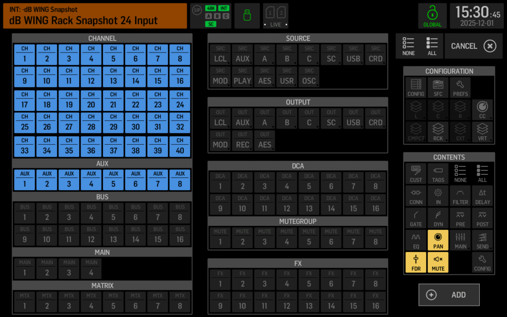 For example, if you want to save the fader, pan, and mute positions for all 48 channels (inputs plus auxes), you can select all those channels on the left, then check only Fader, Pan, and Mute in the Contents section on the right. Press + Add and you’ll have 144 parameters ready to go—without having to touch every single fader. This is my go-to setup for song-to-song transitions where I need consistent control over levels and positioning without affecting EQ, compression, or routing.