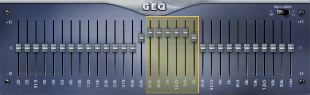 Here’s where things get interesting. I set up a mid-range boost across several bands: +6 dB at 500 Hz and 2 kHz, and +9 dB on the bands in between (630 Hz, 800 Hz, 1 kHz, 1.25 kHz, and 1.6 kHz).