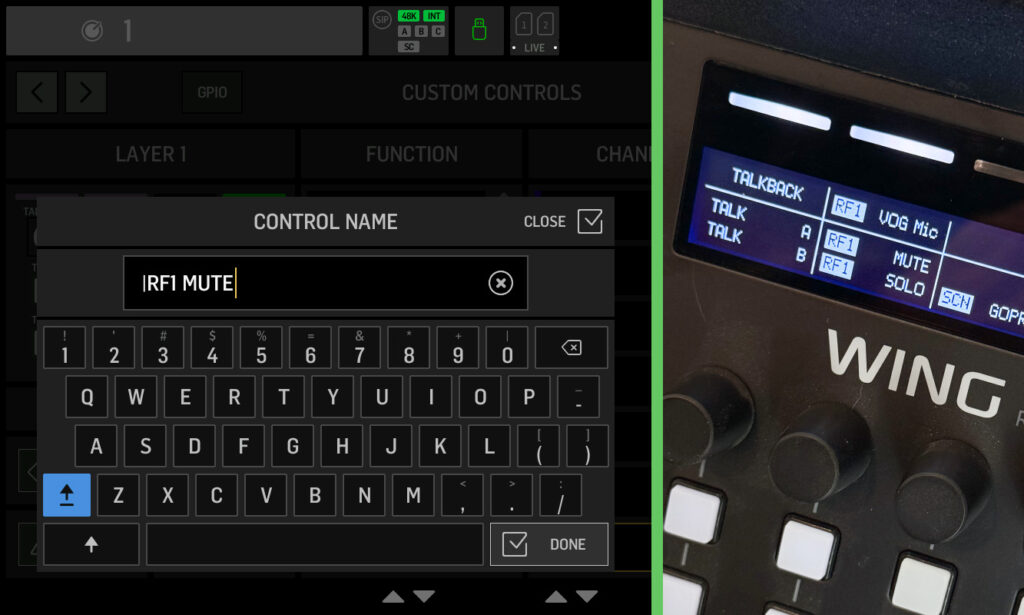 To rename a custom control, tap ‘NAME’ in the lower left under the Control section. A keyboard will pop up where you can enter your custom label. If you want to highlight a word as a badge, add the | character before it. For example, naming a button “|RF Check” displays RF as a highlighted badge followed by “Check” in normal text. This works for any word and makes it easy to visually categorize your controls at a glance.