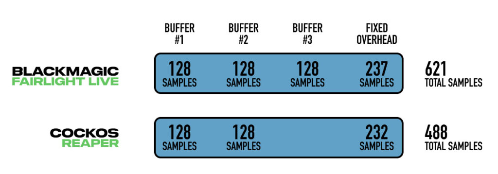 The important thing is not that Fairlight Live is “wrong” or that Reaper is magically bypassing physics. Both systems are working with the same buffer size and the same hardware. The difference is that Reaper measured like a 2-buffer round-trip path plus fixed overhead, while Fairlight Live measured like a 3-buffer round-trip path plus nearly the same fixed overhead. That extra buffer period is what creates the latency gap.