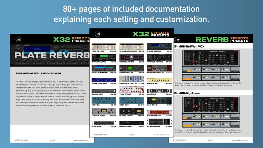 100 effects presets for the Behringer X32 and Midas M32—covering reverbs, delays, compressors, gates, and more. Load them into your console and get polished effects without hours of dialing in settings.
